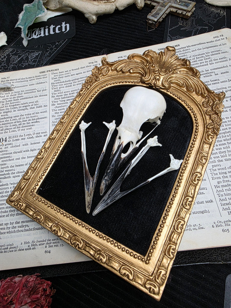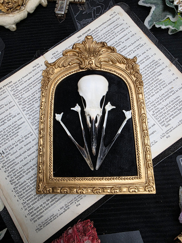 Introducing a stunning ethically sourced crow skull elegantly mounted on a luxurious black velvet backing. Mounted in an ornate golden gothic style frame