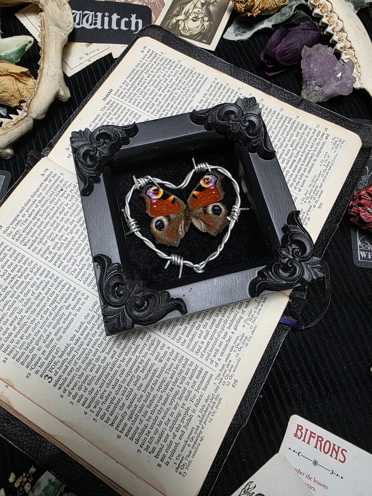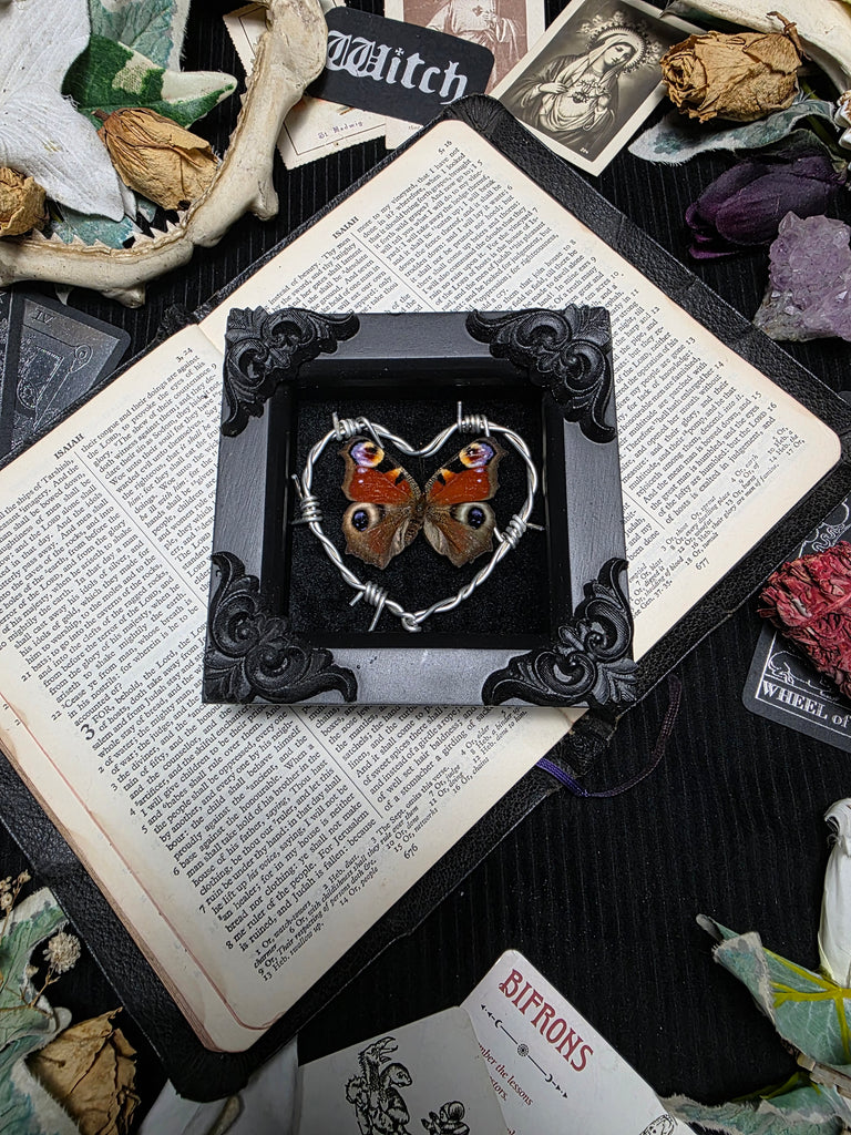 Discover an exquisite display featuring the delicate and enchanting peacock butterfly, ethically sourced and carefully preserved. Mounted against a stunning black velvet backing, this piece is enhanced with a hand made barbed wire heart and refined corner embellishments