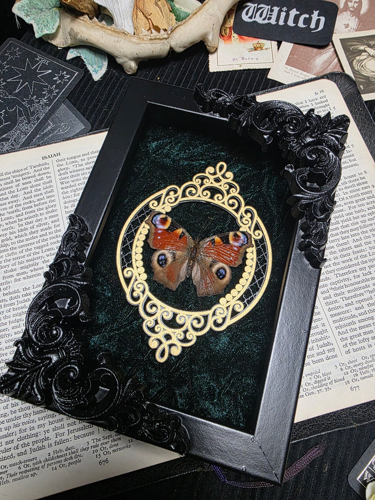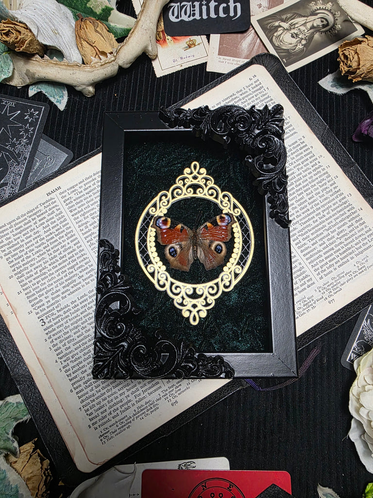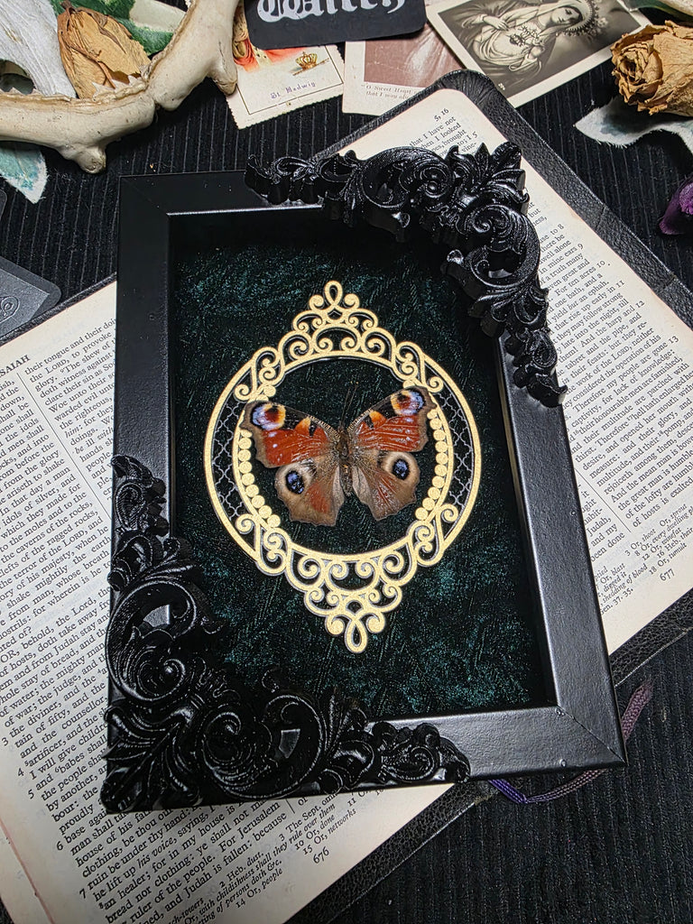 Introducing a stunning ethically sourced red peacock butterfly elegantly mounted on a luxurious green velvet backing. Enhanced with an ornate inner frame and corner details. A perfect addition to any goth home.