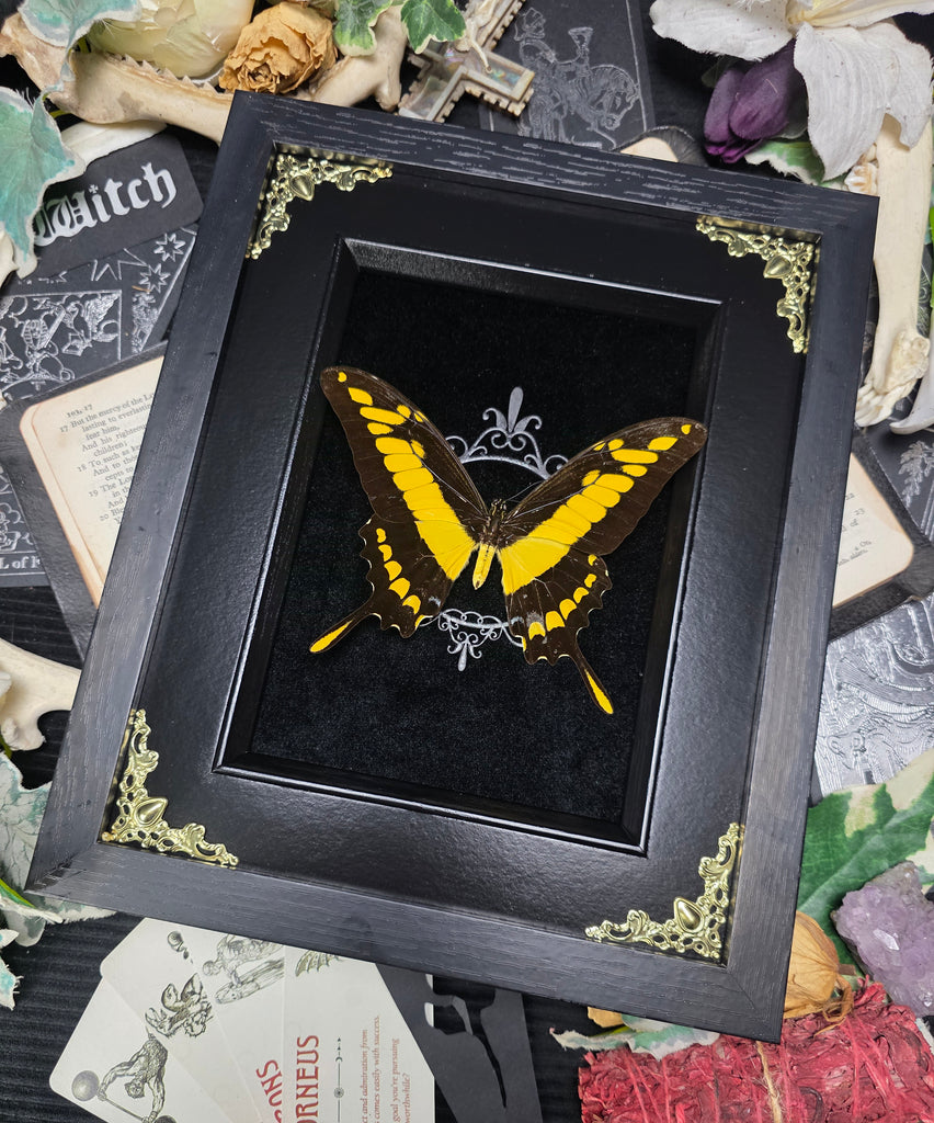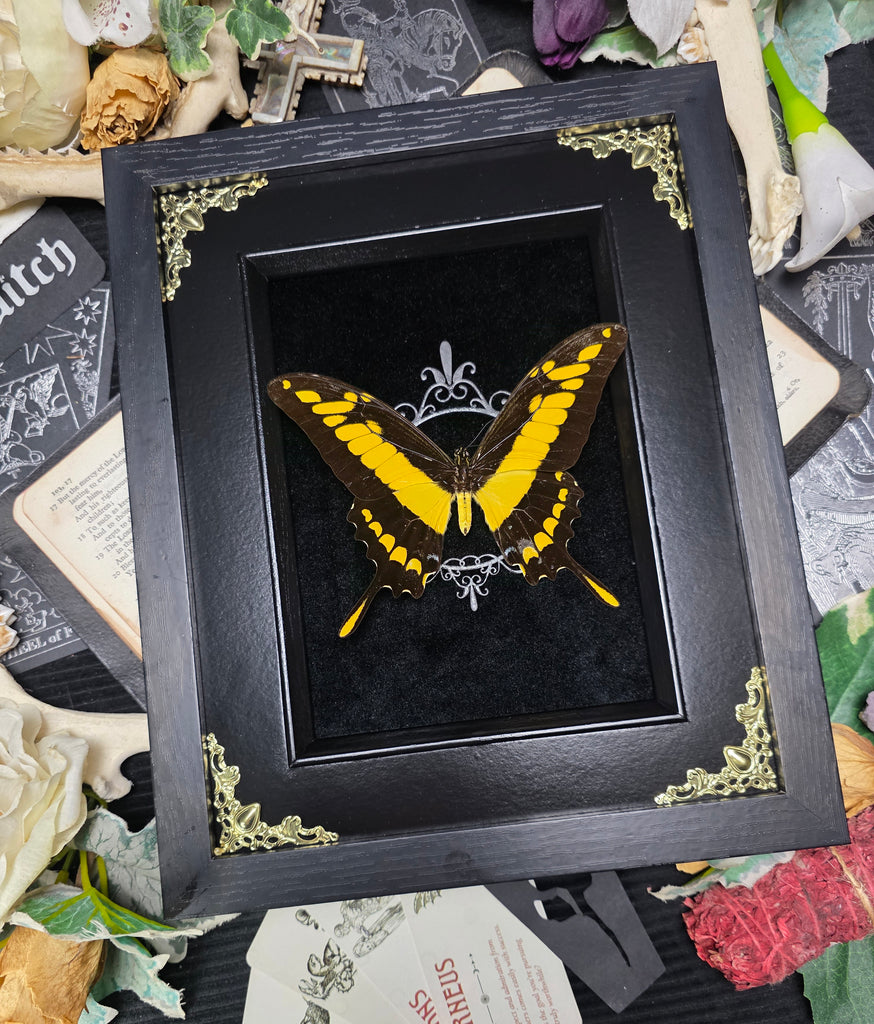 Introducing a stunning king swallotail aka Papilio thoas mounted on a luxurious black velvet backing. Beautifully enhanced with a stunning inner ornate frame and gold corner embellishments.