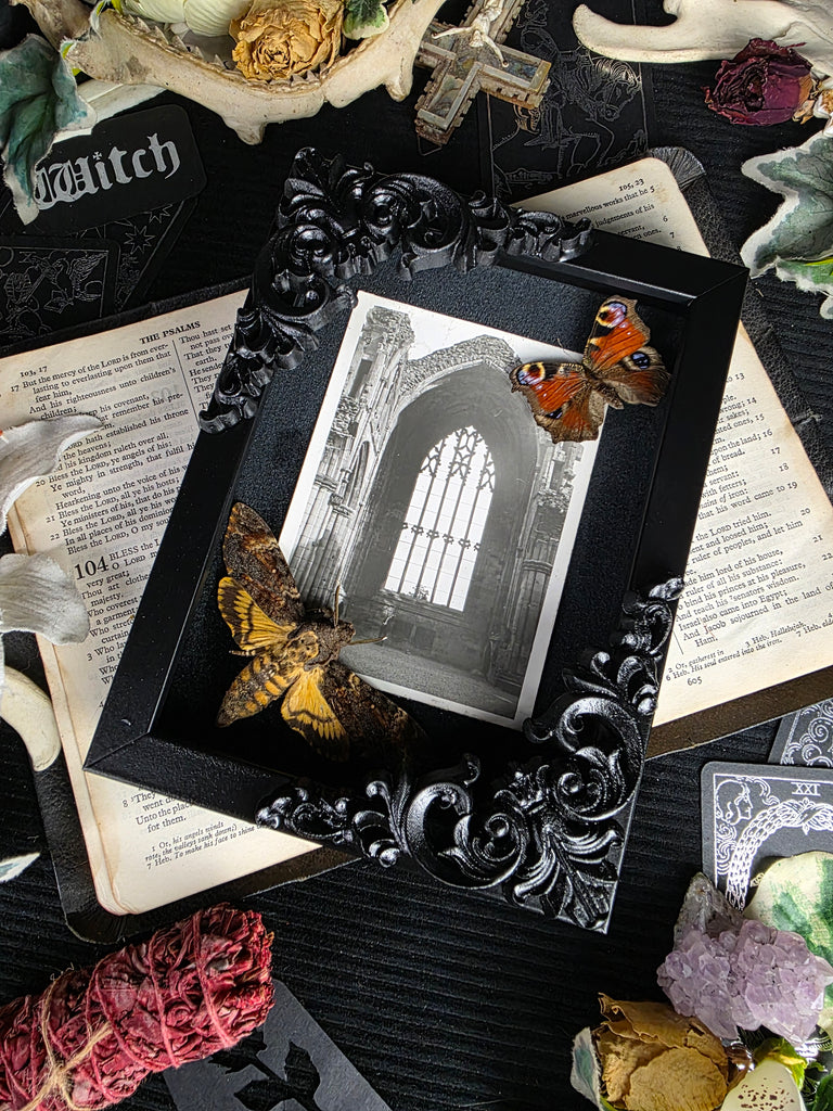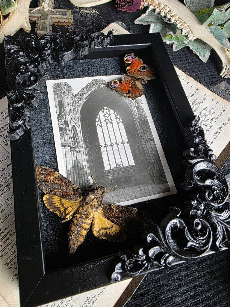 Introducing a captivating art piece featuring an ethically sourced deaths head and peacock butterfly, elegantly mounted on a luxurious black velvet backing. This exquisite display is beautifully enhanced with a vintage church picture from melrose abbey (1965) and corner embellishments.