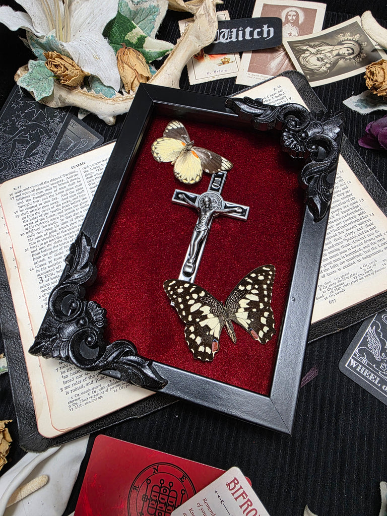 Introducing a captivating art piece featuring a papilio demodoeus and delias beliama butterfly mounted on a luxurious green velvet backing. This exquisite display is beautifully enhanced with a metallic crusifix detail and corner embellishments, creating a striking piece that celebrates the beauty and intricacy of this remarkable butterfly