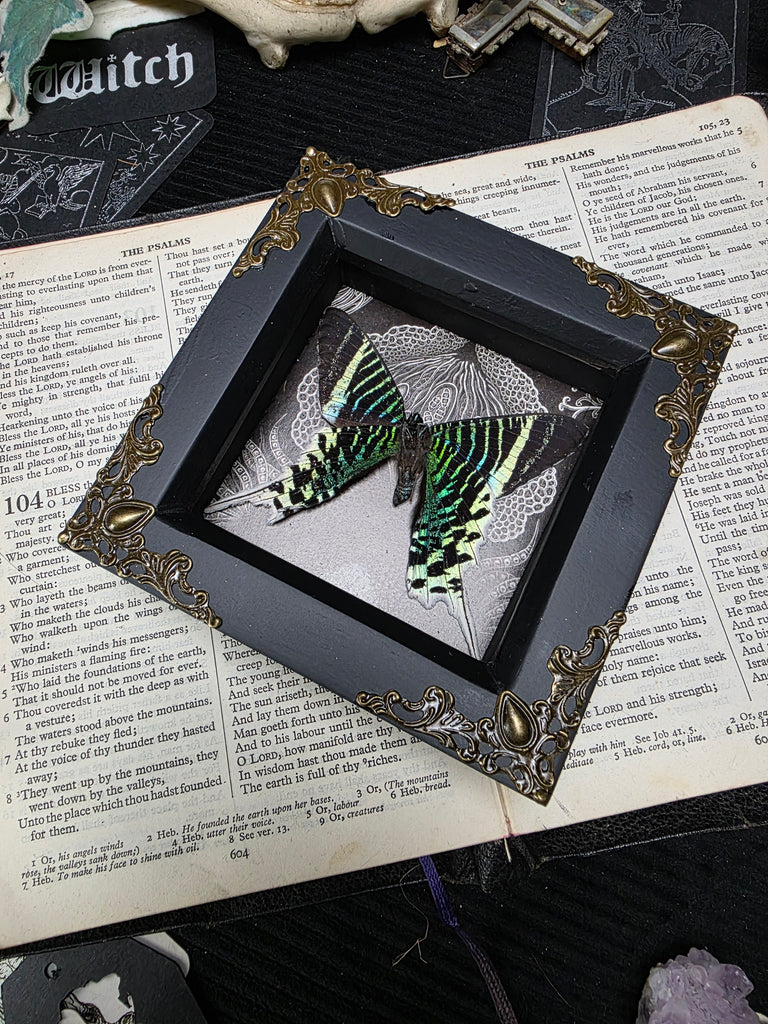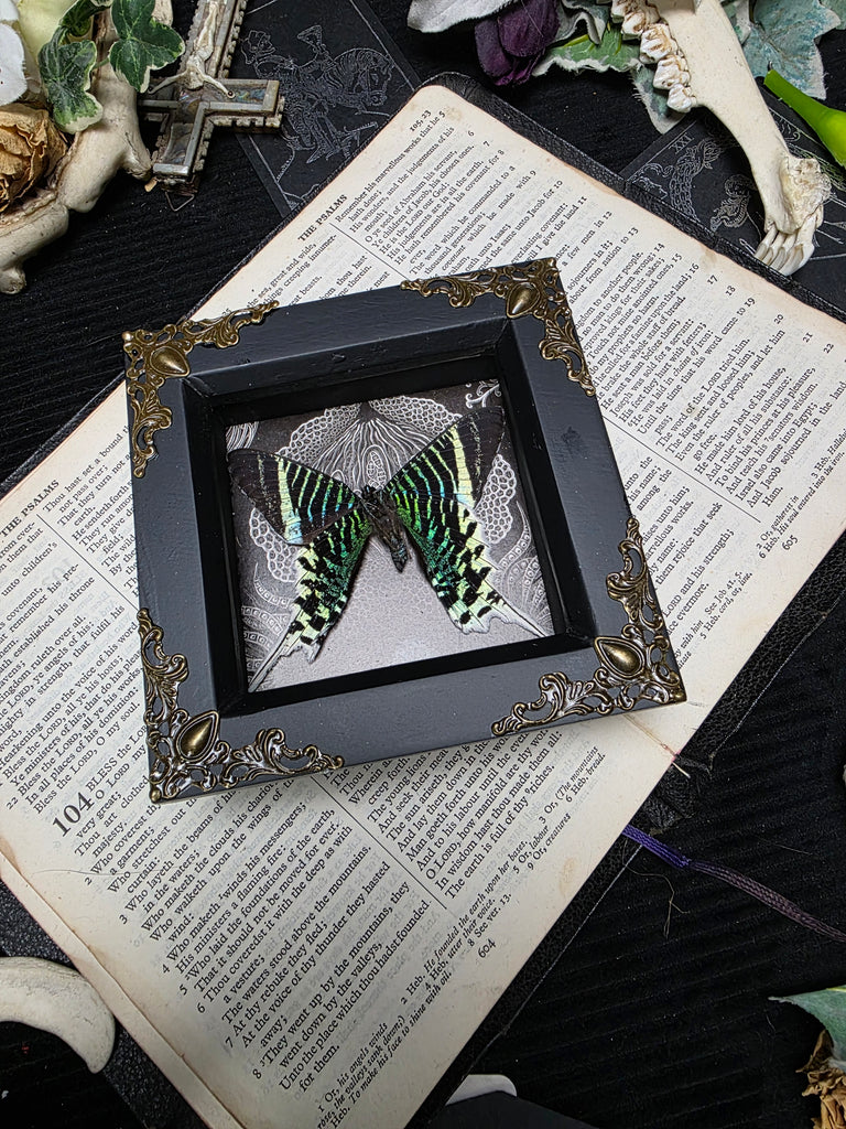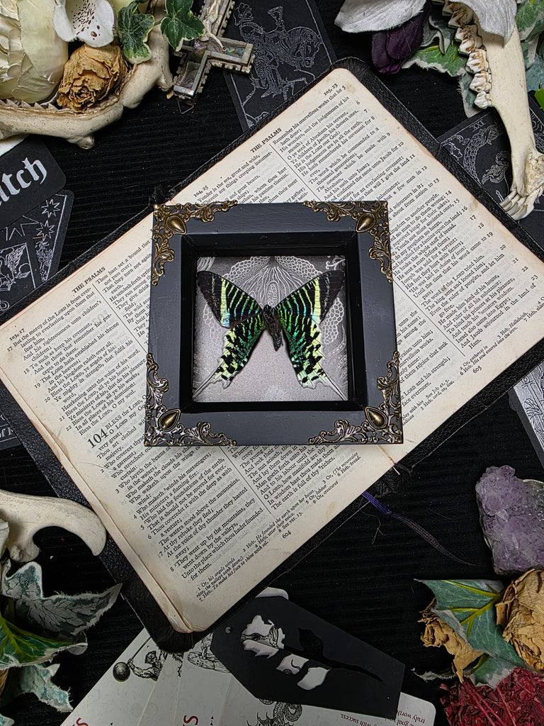 Introducing a stunning urania leilus mounted on an artforms in nature backing. Beautifully enhanced with orante corner embellishments, simple and classic design creating a captivating piece that celebrates the beauty and uniqueness of this remarkable butterfly.