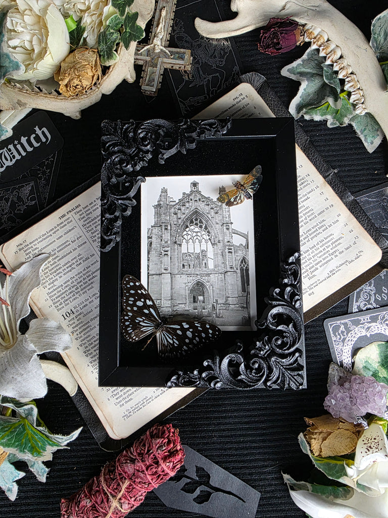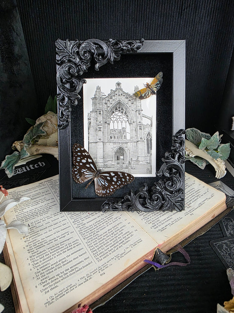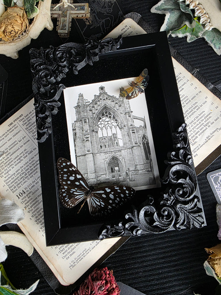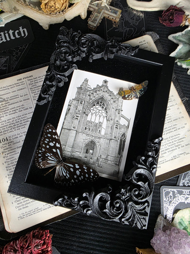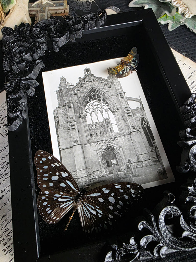 Introducing a captivating art piece featuring an ethically sourced blue tiger butterfly and leaf savia lantern fly elegantly mounted on a luxurious black velvet backing. This exquisite display is beautifully enhanced with a vintage church picture from melrose abbey (1965) and corner embellishments.