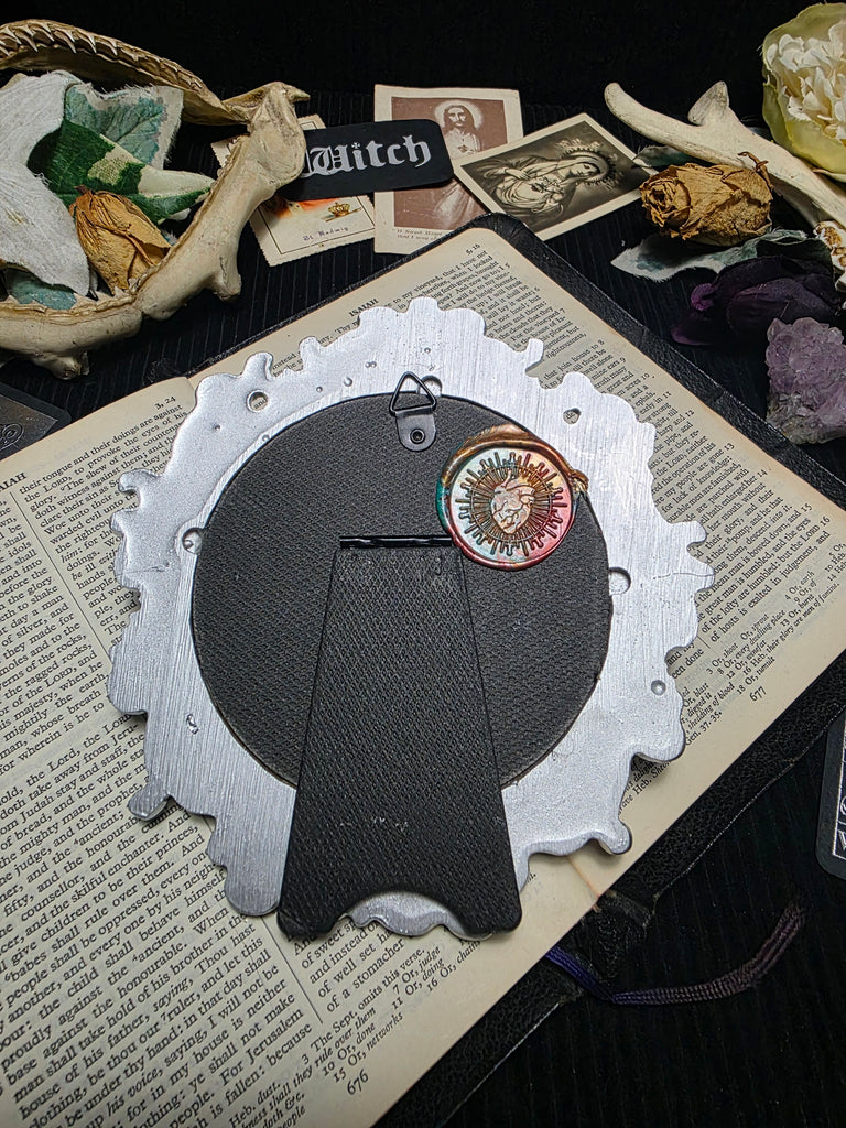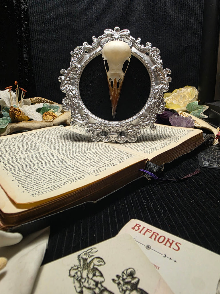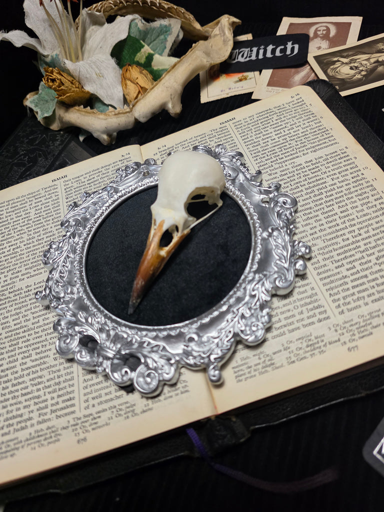 Introducing a stunning real jackdaw akull mounted on a luxurious black velvet backing. Beautifully enhanced in a silver ornate frame. Wall mountable or free standing the perfect pieces for any goth home.