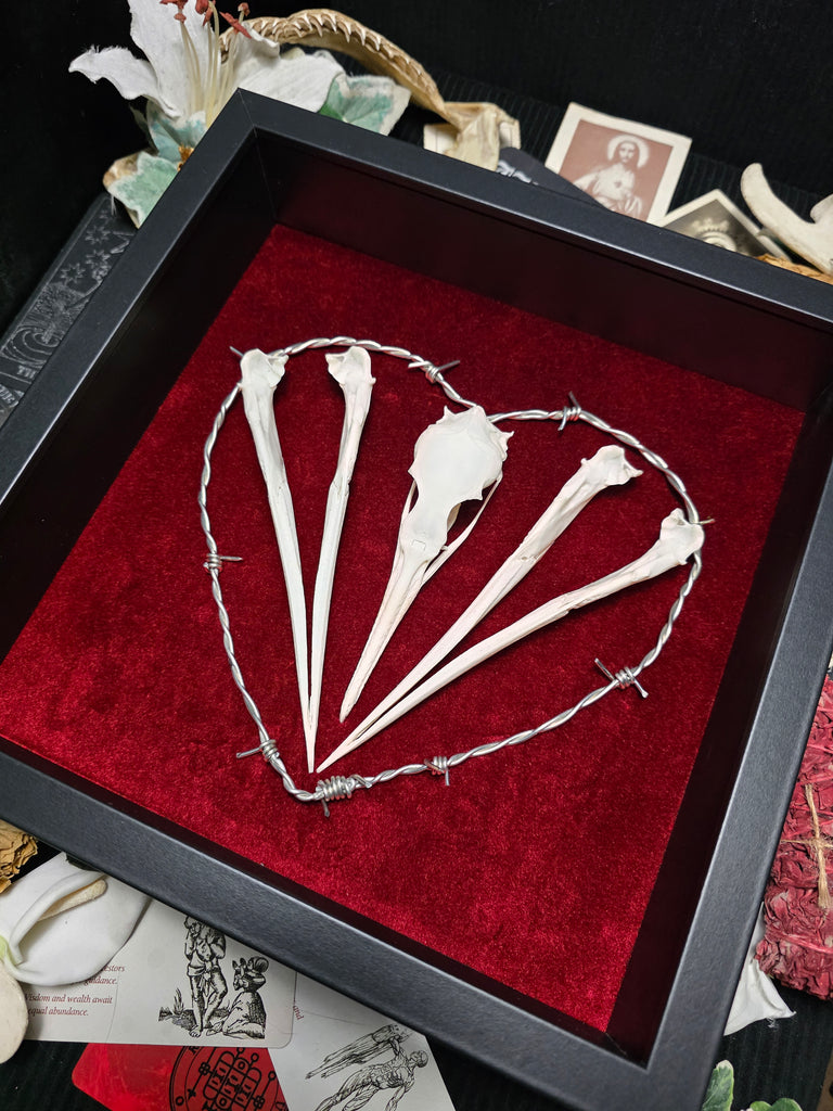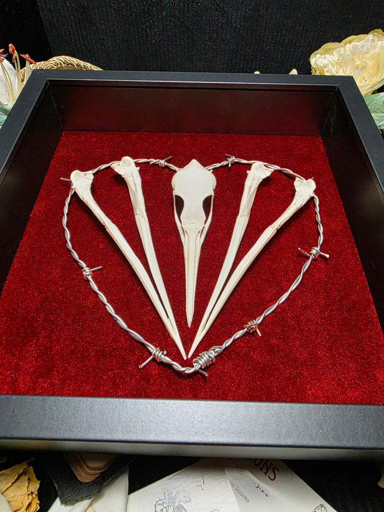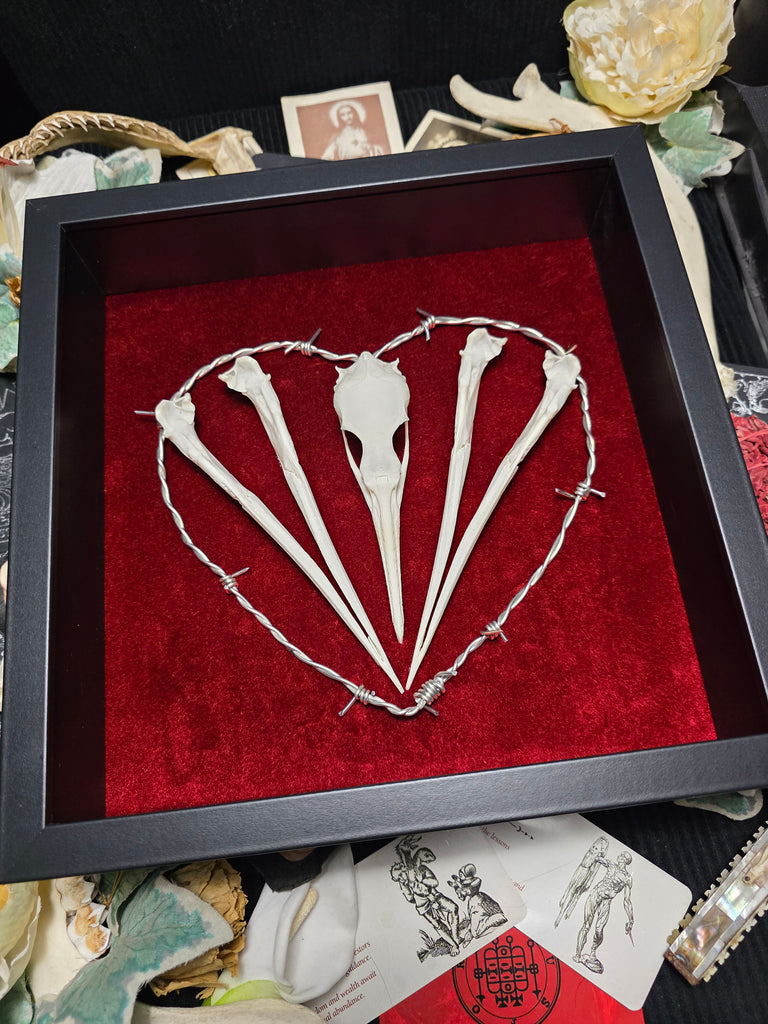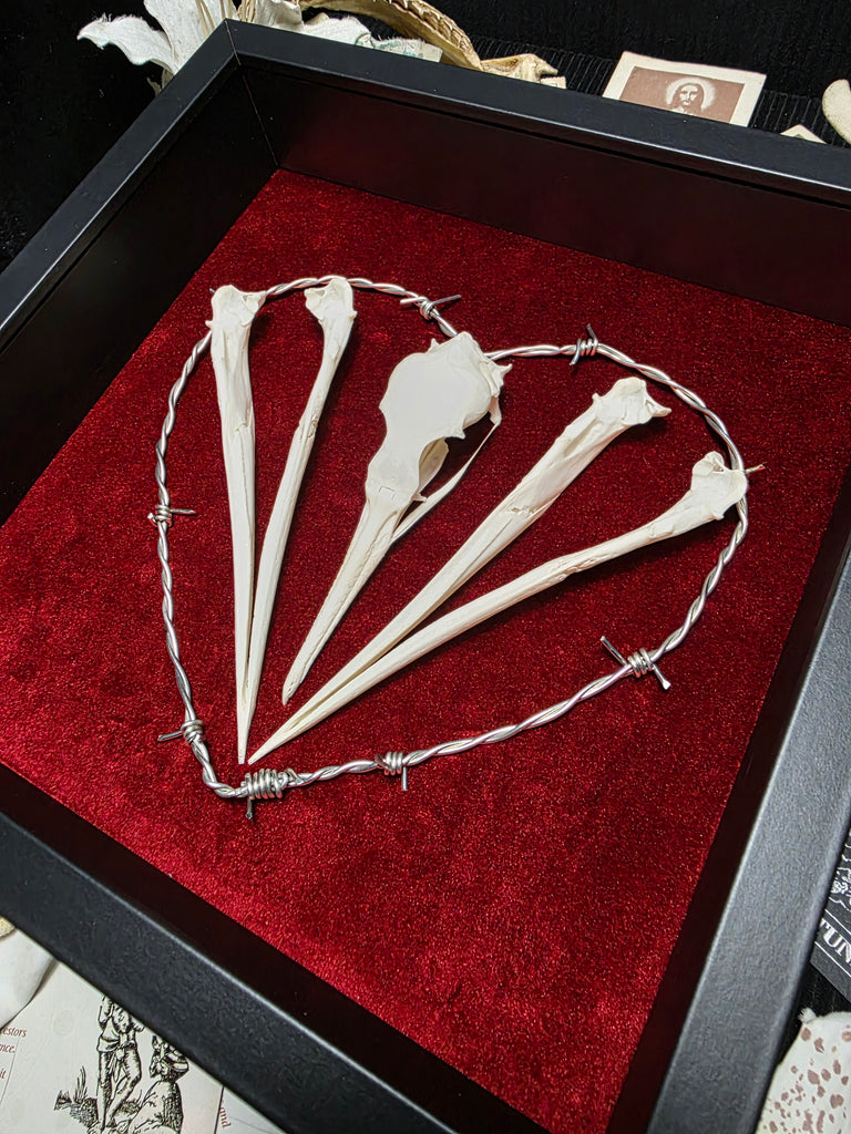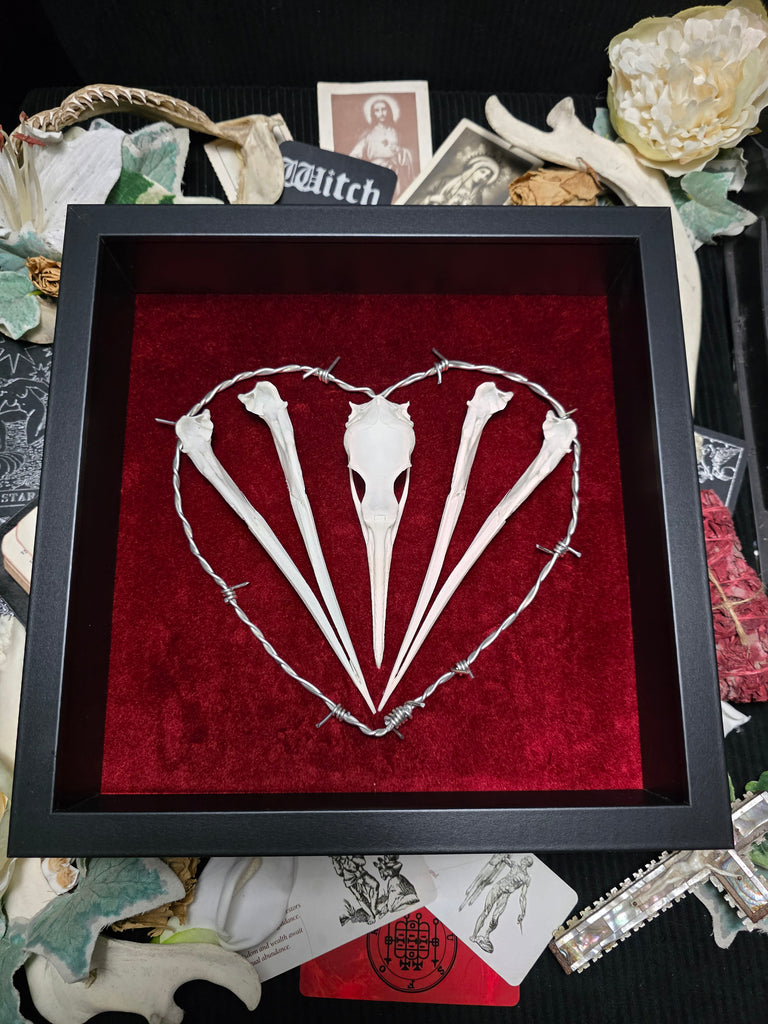 Introducing a stunning cormorant skull mounted on a luxurious red velvet backing. Beautifully enhanced with a stunning hand made barbed wire heart.